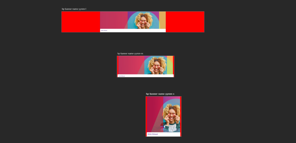 When using a banner with a background image, the image covers the entire banner in full width. HTML content comes on top of the image such as the perso box. The banner is designed in such a way as to leave a free space for the important elements of the visual. When creating the image, this is where the key elements of the campaign such as main character, faces, devices, objects should be located.