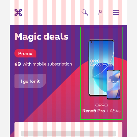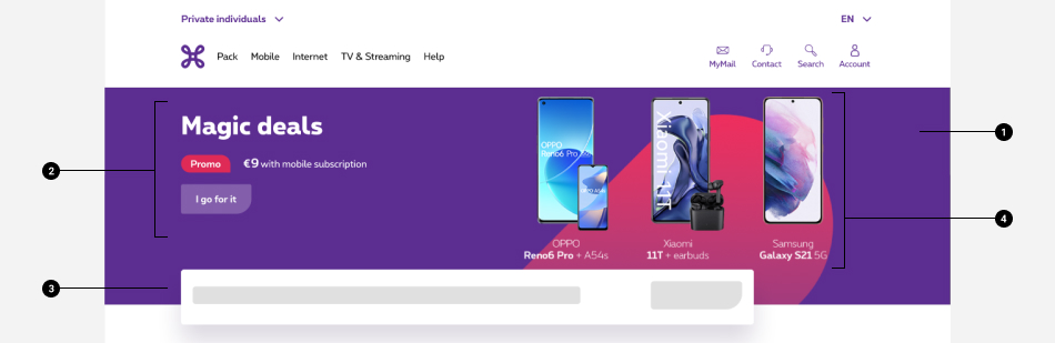 The background image covers the entire banner in full width. HTML content comes on top of the image such as the perso box and the image standalone. The banner is designed in such a way that the image standalone will always have space and be visible in all breakpoints. The image standalone is where the key elements of the campaign such as devices, objects are located. The background image will be the background visual of the campaign for example.