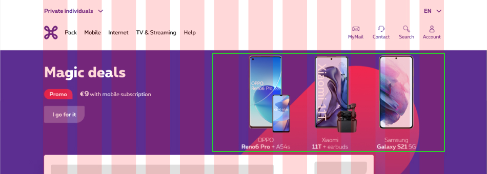 Respect the margins and safe areas in the template and make sure that the main content isn’t placed behind the perso box or in the copy (e.g.: main character, faces, devices, objects). The png visual is placed as so the visual won't get in the way of the header, copy etc.