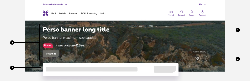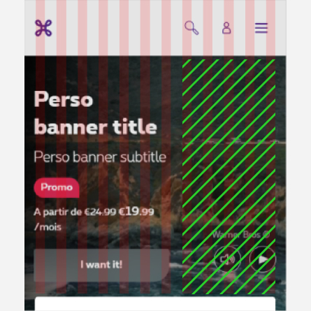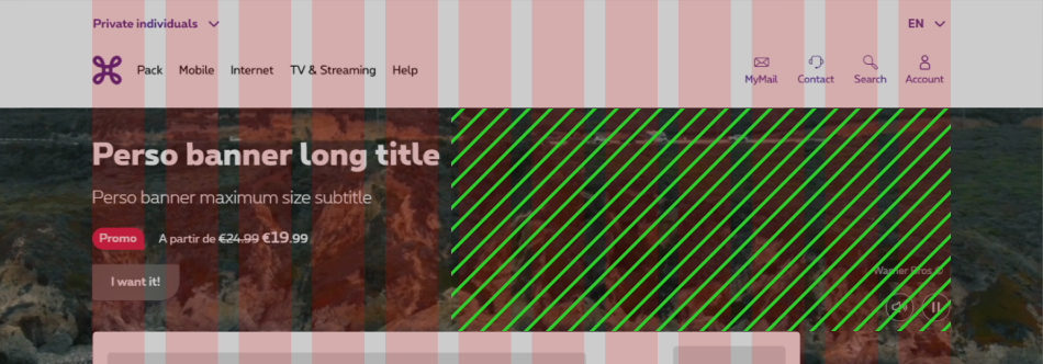 When using a banner with a background video, the video covers the entire banner in full width. HTML content comes on top of the video such as the perso box. The banner is designed in such a way as to leave a free space for the important elements of the visual. When creating the video, this is where the key elements of the campaign such as main character, faces, devices, objects should be located.