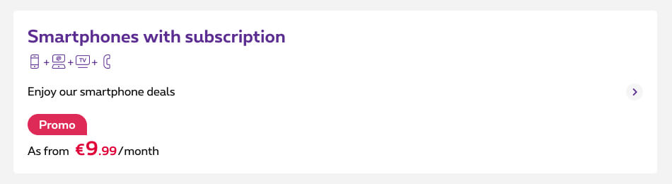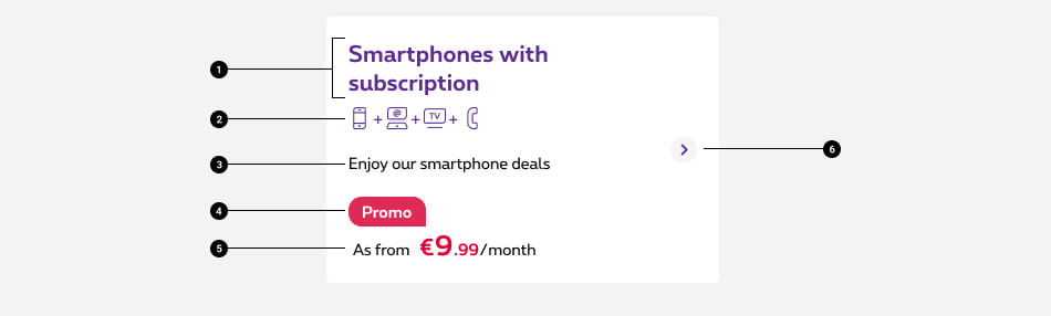 The category box is a panel acting like an entry point. There are no CTAs as it is fully clickable. It can contain a title, icons, content text, prices and promo patches.
