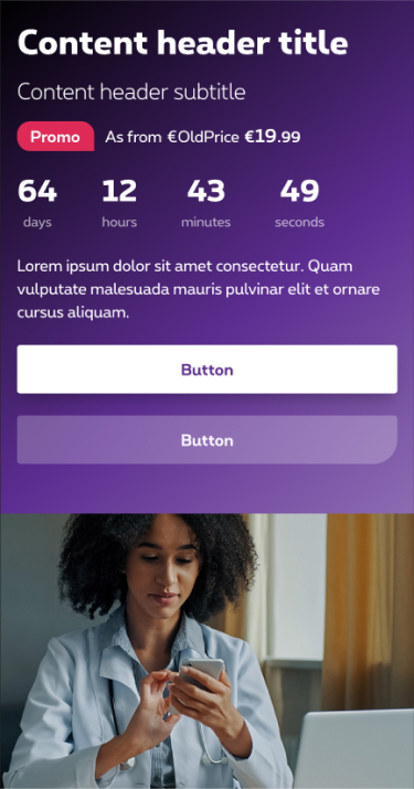 The content header allows you to highlight information at the top of your page. The copy varies and can be supported visually with a plain color/gradient background, an image or a video.