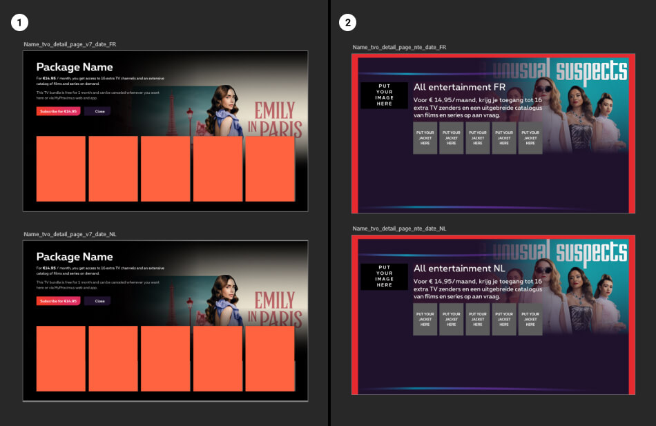 Detail page visuals must be produced in two different formats: NTE decoder and V7 decoder. These visuals should be produced for each TV options and there may be differences for FR and NL.