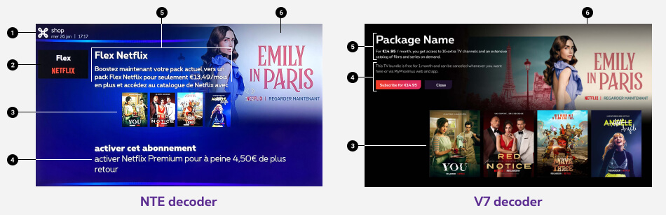 Detail pages are informative pages that open up once you click on a TVO set vignette through the subscription menu. They show the latest TV options' contents and allow the user to subscribe. Detail pages are produced slightly diffrently for two TV decoders: NTE and v7 decoder.