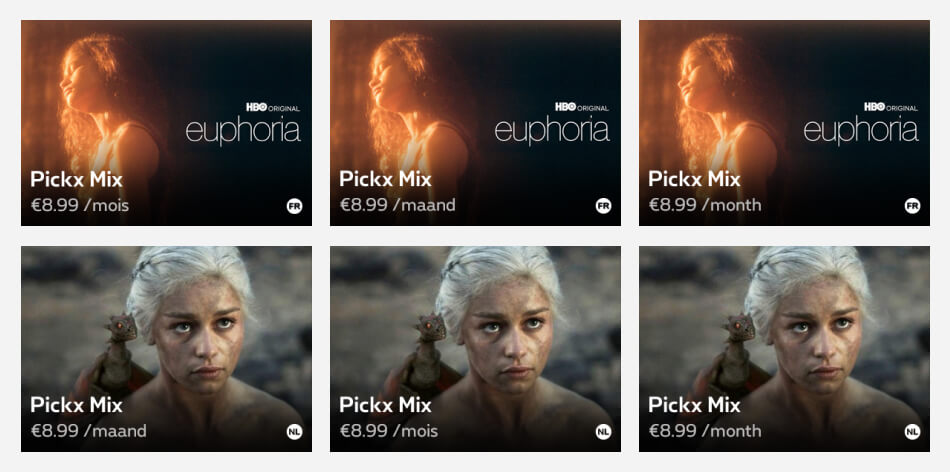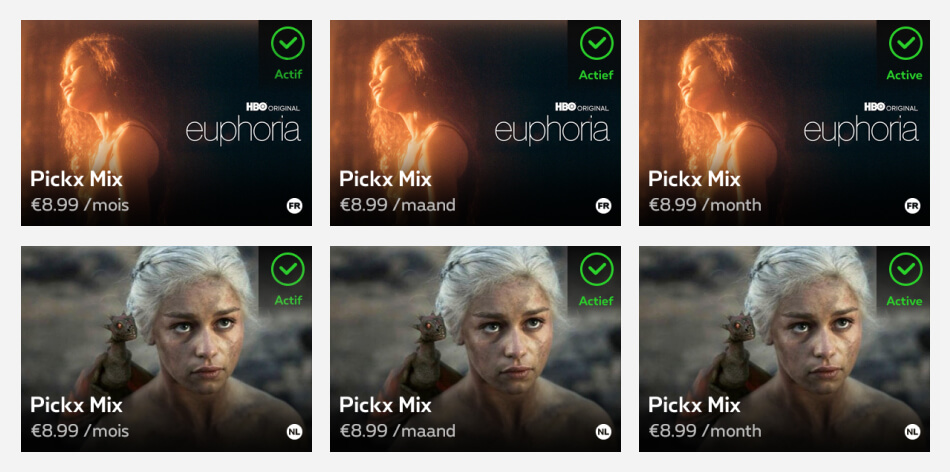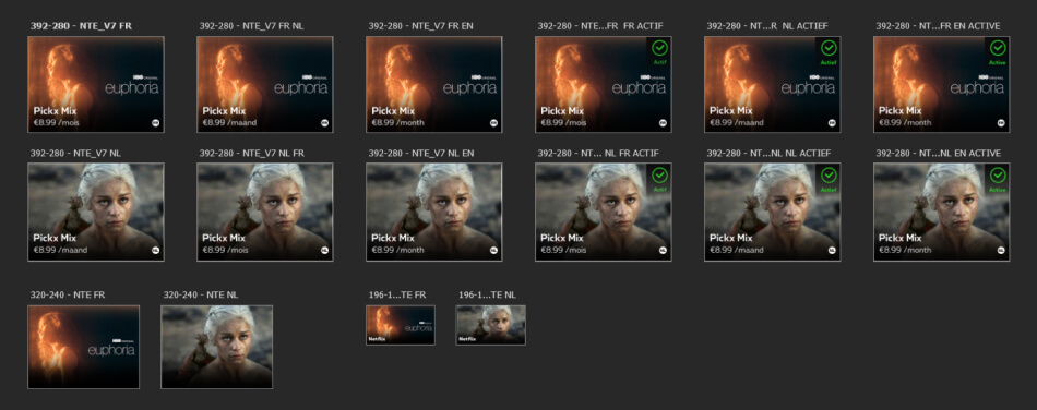 The designer must write the copy itself, since there is no HTML content above the visual, which results in a lot of visuals to produce. The vignettes are produced with an NL patch for the dutch content and an FR patch for the french content. For both NL and FR content, they should be exported with the copy (TV option title, price) in FR, NL and EN. Repeat the same process with the active patch on.